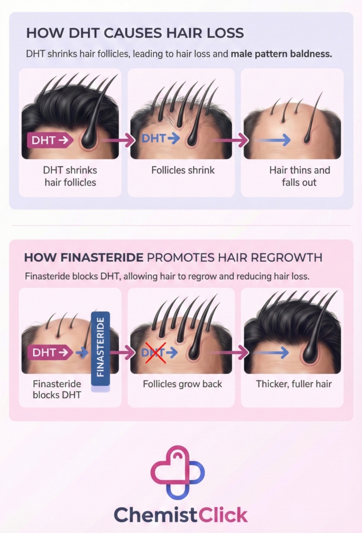 Finasteride treats male-pattern hair loss by lowering levels of a hormone called DHT (dihydrotestosterone) in the scalp.