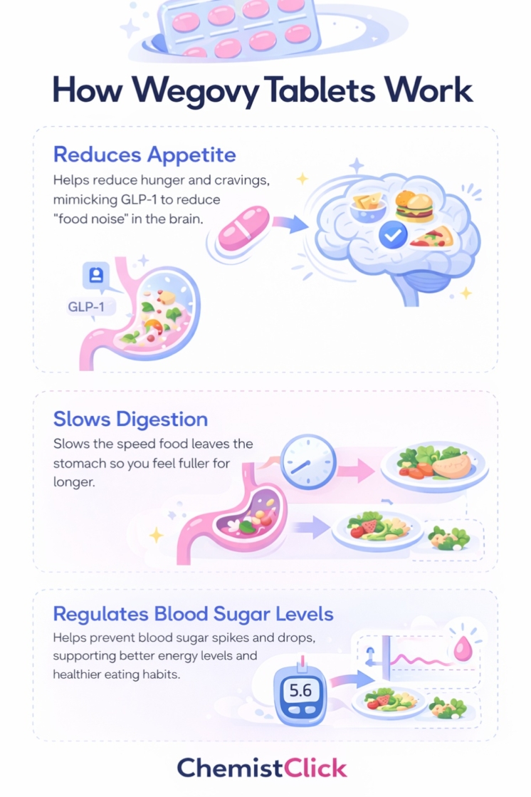 Wegovy tablets work by mimicking GLP-1, so the body gets stronger and more sustained appetite-control signals.