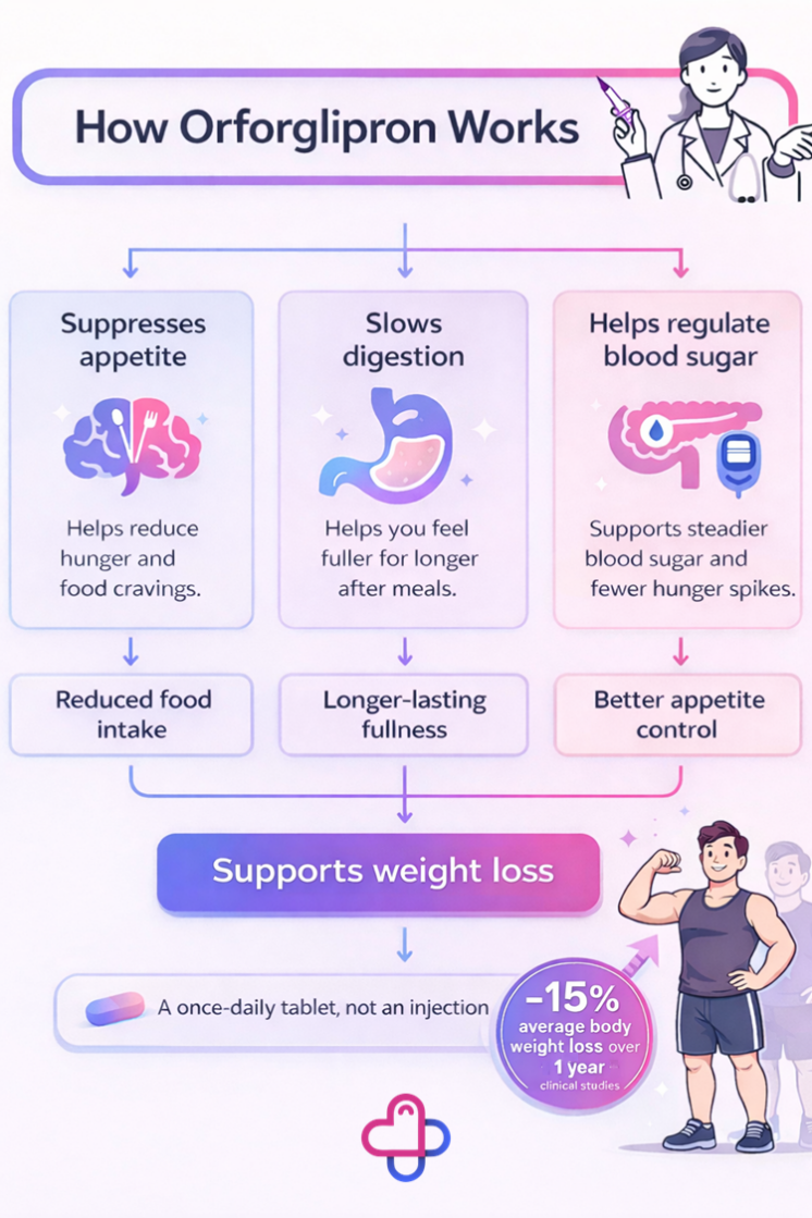 Orforglipron works for weight loss mainly by helping you feel fuller, eat less, and regulate blood sugar more effectively. It does not “melt fat” in a direct way. Instead, it changes appetite and metabolic signals so that eating less feels more manageable, while also improving insulin response in people with diabetes or insulin resistance.