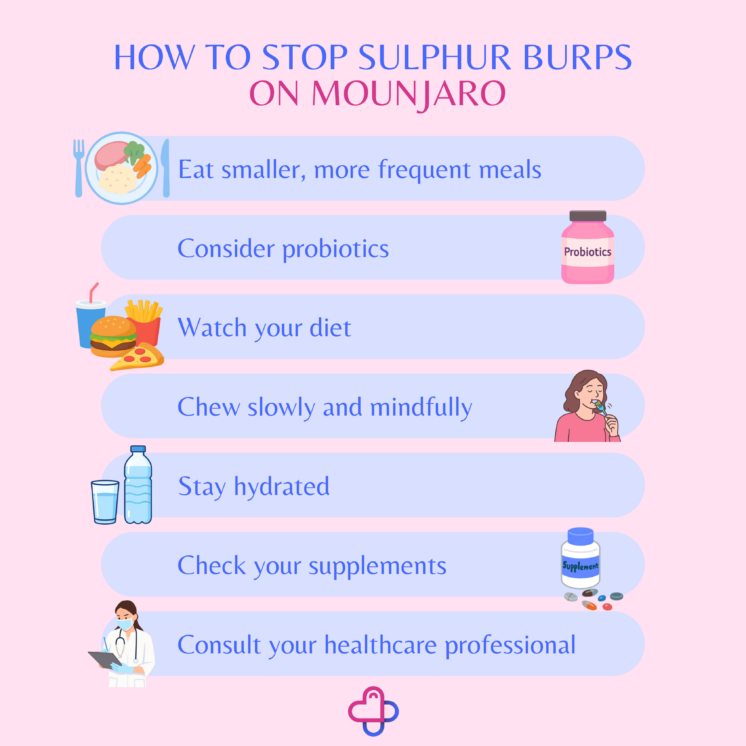 Mounjaro can temporarily change the balance of bacteria in your gut. Probiotics, found in yoghurts or supplements, can help restore a healthy gut flora balance, which may lower the production of smelly gases that cause sulphur burps.