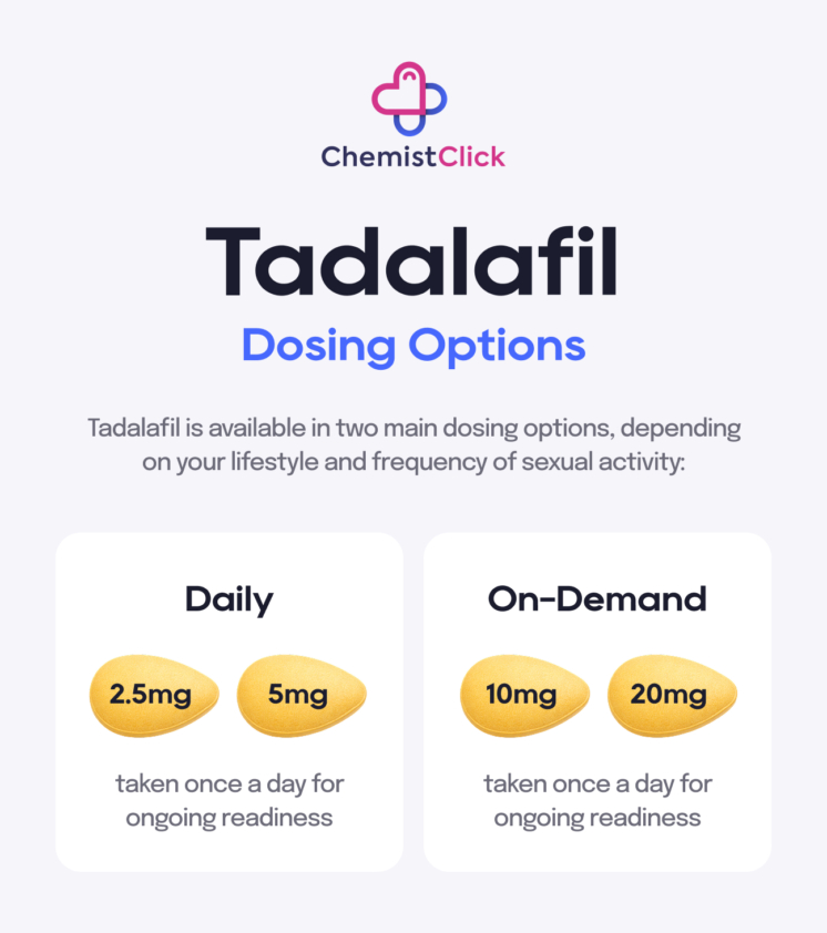Tadalafil is available in two main dosing options, depending on your lifestyle and frequency of sexual activity:
